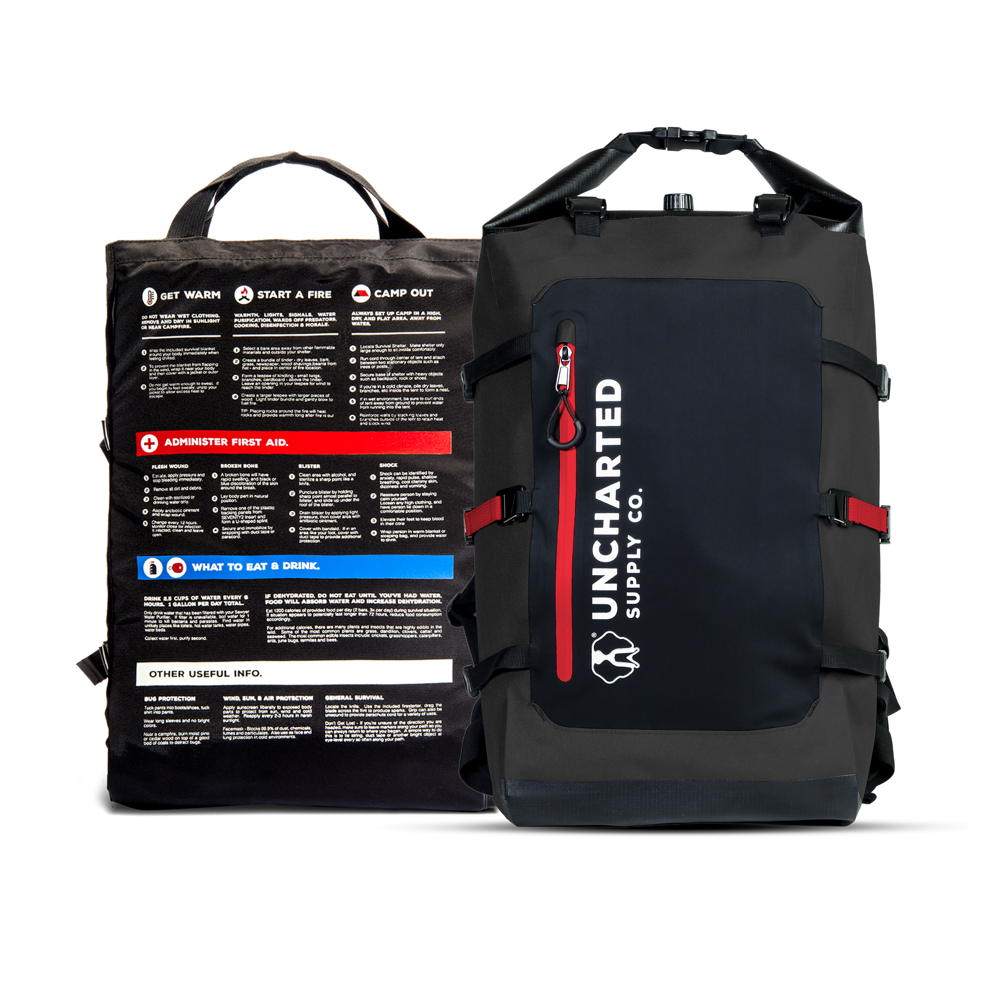 Inside the backpack is a wearable canvas insert supported by two sheets of heavy plastic that double as splints. Basic survival instructions are printed directly to the insert to provide clear steps when adrenaline is spiking. Inside, labeled pockets organized by use case secure every tool.